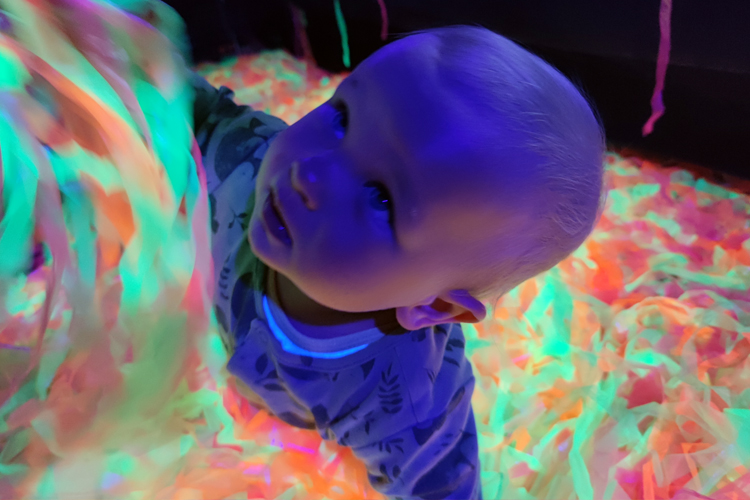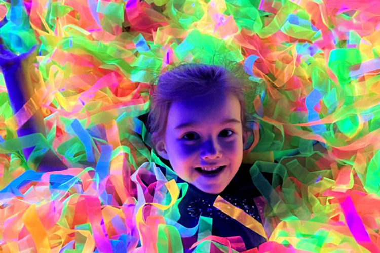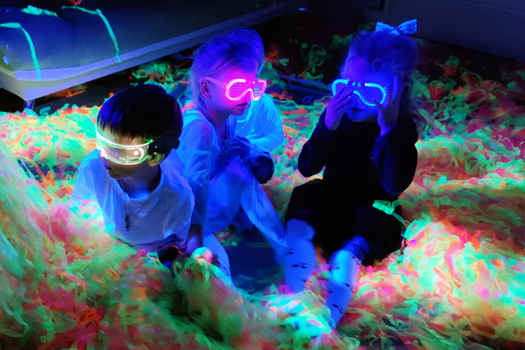 Неоновая бумажная дискотека проводится в темном помещении.
